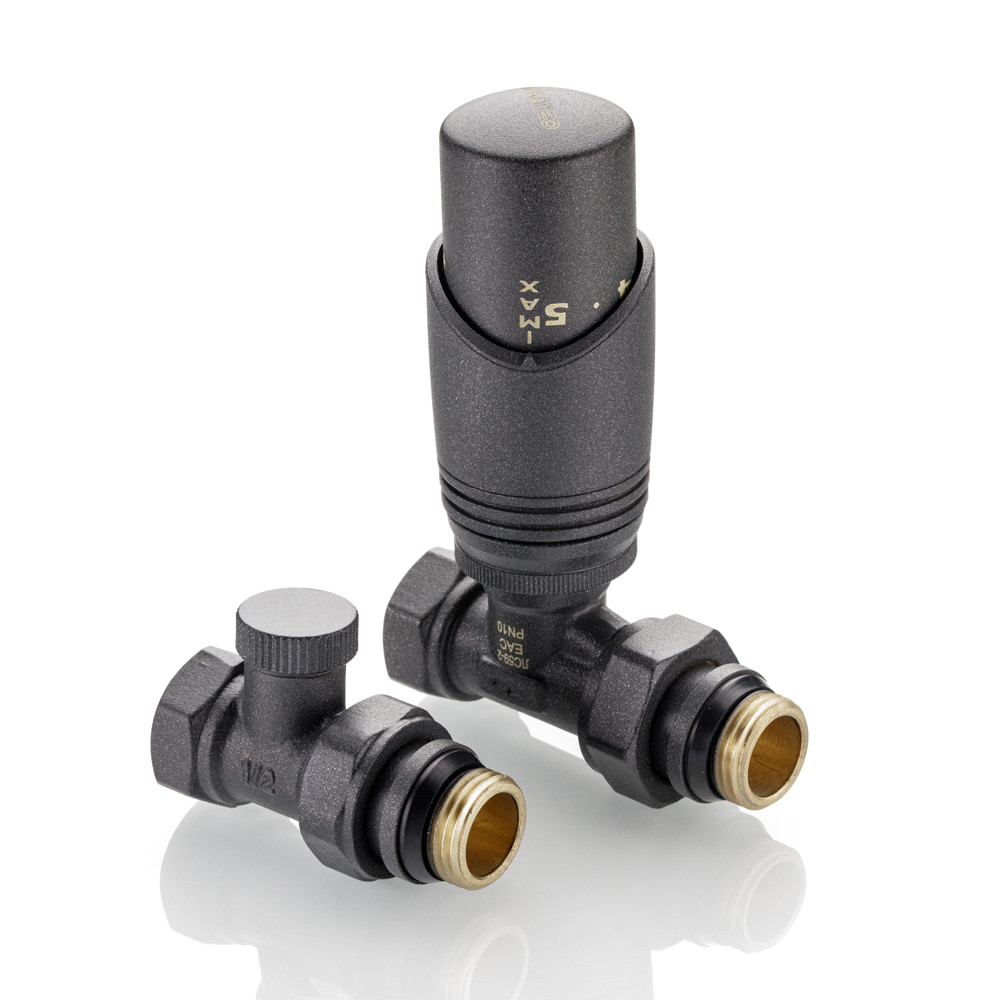 Клапаны и термоголовка комплекта выполнены в сером цвете.