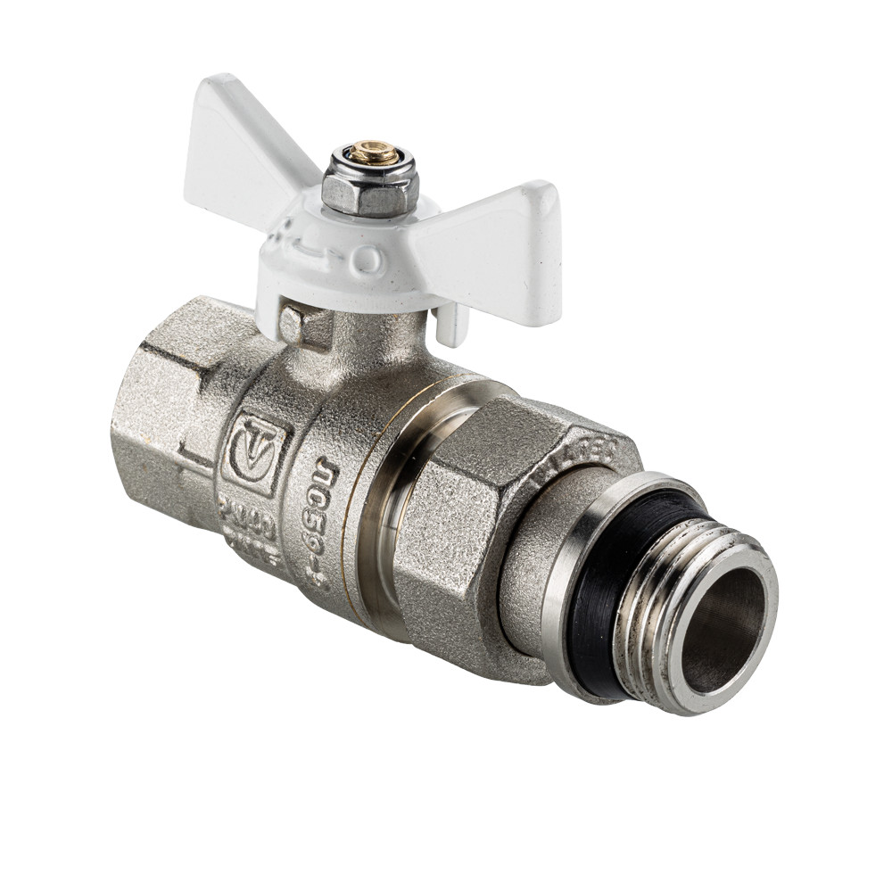 Полнопроходной шаровой кран VT.227S.NRW серии «BASE-ГОСТ» оснащен силуминовой ручкой-бабочкой с эпоксидной эмалевой окраской белого цвета и полусгоном c уплотнительным кольцом из EPDM. Резьба присоединений – внутренняя/наружная.
